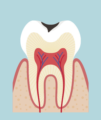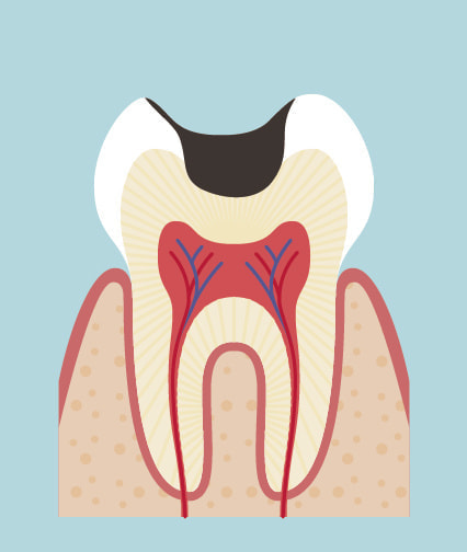 歯の一番表層のエナメル質が溶け始めます。歯の表面に穴が空き、黒っぽい色をしています。痛みはほとんどありませんが、冷たいものを飲んだ時にしみる事があります。この段階で気がつき、治療をする事ができるのが良いといえます。
