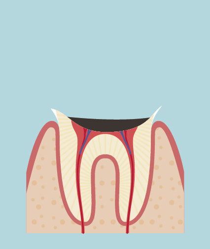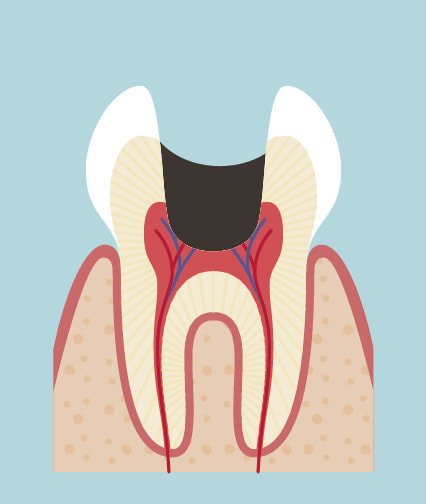 むし歯が神経(歯髄)まで到達した状態です。この段階までむし歯が進行すると、大きな痛みが襲ってきます。歯の神経が残せる状態か、そうでないかを見極めますが、残せない場合は神経を取り除く治療(抜髄)や被せ物(クラウン)が必要になります。